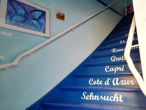 Ich ziehe eine blaue Schublade auf. Eine Horde blauer Schlümpfe blickt mir entgegen. 1958 erfand diese Figuren der belgische Zeichner Peyo alias Pierre Cuilford. Auf dem blau angestrichenen Schreibtisch sitzt eine blauhäutige außerirdische Spezies aus dem Film Avatar. Aliens sind bis zum Beweis des Gegenteils reine Hirngespinste und werden häufig mit blauer Hautfarbe phantasiert um ihre Exotik zu betonen. Daneben sitzt der blaue Dschinn aus dem Disneyfilm Aladin, der dem Besitzer seiner Lampe drei Wünsche erfüllt. In der zweiten Schublade sitzt das Krümelmonster aus der Muppetshow. Jim Henson und Frank Oz haben es 1966 geschaffen. Es gilt als das freundlichste Monster der Welt. Zumindest wenn es satt ist und genug Kekse zu essen hat. Ansonsten ist es bereit selbst die Verpackungen zu essen. Eine angenagte Sachertorteschachtel auf dem Tischchen verdeutlicht dies. Der hinduistische Gott Krishna wird ebenso mit blauer Hautfarbe dargestellt. Eine schöne Geschichte erzählt, dass dieser sah, wie die Welt vom Bösen vergiftet war. Er nahm daher alles blaue Gift in sich auf und kam so zu seinem Hautton. Mit heulenden Sirenen fährt auf der Straße ein Polizeifahrzeug vorbei. Der Schein des flackernden Blaulichts spiegelt sich auf den bläulichen Gardinen. Eingeführt wurde das blaue Licht für Polizeiautos in den 1950er Jahren. Auch die Feuerwehr und Rettungsdienste dürfen es benutzen. Über die vielfältigen Bedeutungen und Verwendungen meiner Lieblingsfarbe Blau bin ich stark beeindruckt. Irgendwann fällt mir allerdings die kalte, eisige Farbgebung aufs Gemüt. Ich schlendere aus dem Innenhof und biege um die Ecke. Hier liegt das Restaurant ‚Blaues Loch‘. Ich ziehe die Tür auf und schon hat mich das nächste Blau verschluckt.