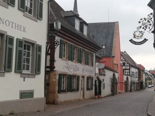 Etwa 1400 v. Chr. Entdeckte man in einer Keilschrift das Wort wiyanas. Bei Homer findet sich die Vokabel woinos. Aus dem lateinischen Ausdruck vinos für Wein entstanden die modernen Worte vin (französisch), vino (italienisch und spanisch) sowie vinho (portugiesisch). Ebenso ist wine (englisch) und die deutsche Bezeichnung ‚Wein‘ aus dem Lateinischen Begriff abgeleitet. Wein ist in allen Kulturen und Ländern beliebt. Mal mehr, mal weniger. In Deidesheim eher mehr, wie ein gerahmtes Sprüchlein an der Wand beweist: ‚Morgens ein Gläschen, des Mittags zwei und Abends vergisst man das zählen dabei!‘ An der schönen Deutschen Weinstraße übernachten pro Jahr etwa rund 4 Millionen Gäste. 85 Km verläuft die gesamte Route durch Deutschlands größtes zusammenhängendes Weinbaugebiet. Mehr als 100 Millionen Rebstöcke stehen hier und tragen die Trauben von mehr als 5 Dutzend verschiedener Rebsorten. Rund 1500 Weingüter und zwei Dutzend Winzergenossenschaften erzeugen im Anbaugebiet der Pfalz etwa 2,3 Millionen Hektoliter Wein pro Jahr. Jede 4. Flasche des deutschen Weines kommt von hier. ‚Für Sorgen sorgt das liebe Leben und Sorgenbrecher sind die Reben‘ spiegelt ein anderer gerahmter Spruch das Lebensgefühl der Region wieder.