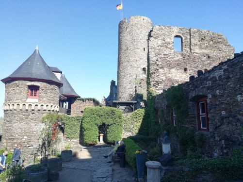 Um 1800 hätte ich von meinem Standpunkt aus die Mosel gar nicht sehen können. Alle Gemäuer der Stadt Alken waren durch eine hohe Stadtbefestigung von jeglichem Blick abgegrenzt. Dadurch war der Blick auf den Fluss stets versperrt. Über winzige Stufen erklimme ich die unbedeutende Treppe hinauf zum Herrschaftshaus. Trotz ihrer Begrenztheit haben die Stiegen einen derart großen Abstand, als wären diese von Riesen angelegt worden. Meine Waden durchfährt bei jedem aufsteigenden Schritt ein schmerzhafter Ruck. Dann stehe ich endlich unterhalb der mittelalterlichen Mauern. Spitz ragen die Dächer der in die Burganlage gedrängten Türmchen in den azurblauen Himmel. Eine Pfälzer Fahne krönt den zentralen Schlossturm. Ein mit dunklem Schiefer bedecktes Plumsklo ziert die Außenfassade. Aufstrebende Glasfenster schmücken einen großen Teil der Anlage. Die Fensterläden sind in schrägem Muster leuchtend Gelb und Rot bestrichen.