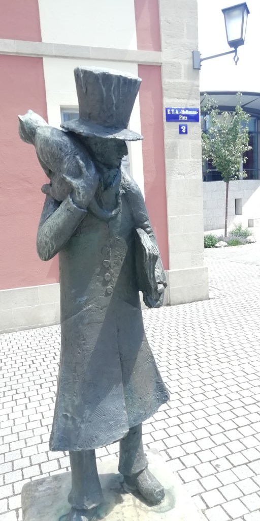 Das Haus in Bamberg, in dem einmal E. T. A. Hoffmann gewohnt hat, ist denkbar unscheinbar. Ich hätte es fast nicht gefunden. Aber schließlich prangt an einer Glasscheibe des E. T. A. Hoffmann Theaters eines seiner Zitate. ‚Ich denke mir mein Ich durch ein Vervielfältigungsglas – Alle Gestalten, die sich um mich bewegen sind Ichs und Ich ärgere mich über ihr Tun und Lassen.‘ Der 32-jährige Hoffmann hatte Jura studiert und war mit dem Zusammenbruch des preußischen Reiches arbeitslos geworden. Er hatte daraufhin eine Stelle als Musikdirektor am Bamberger Theater angenommen. Am 1. Mai 1809 zog er daher mit seiner Frau Marianna, genannt Mischa, nach Bamberg. Die gemeinsame Tochter Cäcilia war kurz zuvor im Alter von 2 Jahren verstorben. Das Ehepaar wohnte anfangs in einer Wohnung direkt am Regnitzkanal. Allerdings gab es immer wieder Ärger mit der Vermieterin, die dem Musiker das Klavierspielen verbieten wollte. Die Hoffmanns zogen ein paar Häuser weiter. Jetzt bewohnten sie zwei Etagen über dem Besitzer des Hauses, dem Trompeter Kaspar Warmuth. In seinem Tagebuch notierte E. T. A. ‚Neue angenehme Wohnung bezogen mit herrlicher Aussicht in Berg und Thal. Auch ein Poetenstübchen dabei.‘ Darüber freute er sich wahrscheinlich besonders, denn Hoffmann schrieb dort als einer der ersten Phantasie- und Horrorautoren Deutschlands seine phantastischen Geschichten. Leider machte der Kater seines Hauswirts dicht neben seinem Schlafzimmerfenster der Nachbarskatze, in die er seit März verliebt war, jammervolle und dennoch in Gefühlen tief entbrannte, zärtliche Geständnisse. Hoffmann dürfte das erheblich beim Schreiben gestört haben.