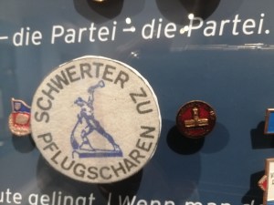 Der Museumsführer winkt mich in den nächsten Ausstellungsraum. Der Wahlspruch der Partei prangt in großer Schrift über einer Vitrine voller DDR-Abzeichen. Eines ragt heraus. ‚Schwerter zu Pflugscharen‘, war das Symbol der DDR-Friedensbewegung, auf dem ein Schmied ein Schwert in eine Pflugschar hämmert. Tatsächlich hatte bei einem ostdeutschen Kirchentag jemand vor aller Augen ein Schwert zu einer Pflugschar umgeschmolzen. Solche friedlichen Bewegungen wurden von der Sicherheitspolizei der Sozialistischen Einheitspartei Deutschlands (SED) konnte, absolut verfolgt. Die einzige Partei, die man in der DDR wählen konnte. Hatte die Gestapo im 3. Reich 3.000 Mitarbeiter für ganz Deutschland, so hatte das Ministerium für Staatssicherheit (MfS) in der DDR 1989 etwa 90.000 Mitarbeiter für die überschaubare DDR. Ich berichte aus meinem Bekanntenkreis. Meine Freundin wuchs in der DDR auf und kam mit 14 Jahren ein Jahr nach der Wende nach Westdeutschland. Gestern waren wir wandern und sie hatte mir von einer erfüllten Kindheit bei den Jungpionieren der DDR berichtet. Der Ehrenamtliche Mitarbeiter nickt zustimmend. ‚Sicher. Man hatte ja etliche Jugendgruppen, mit denen man in der Freizeit viel unternehmen konnte. Dies fing bereits bei der Einschulung mit der Zugehörigkeit zu den Jungpionieren an. Bis man schließlich eventuell selbst Führer einer Pionierjugendgruppe wurde. Die Teilnahme an diesen Freizeitverbänden war freiwillig. Wer keine Mitgliedschaft hatte und keines der charakteristischen blauen Halstücher besaß, war trotzdem automatisch Außenseiter im System. Den die Partei hat ja schließlich immer Recht!‘