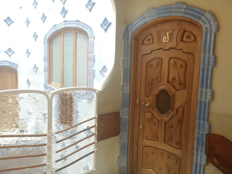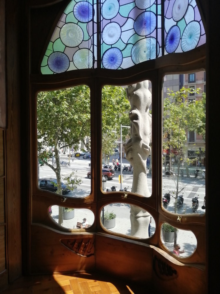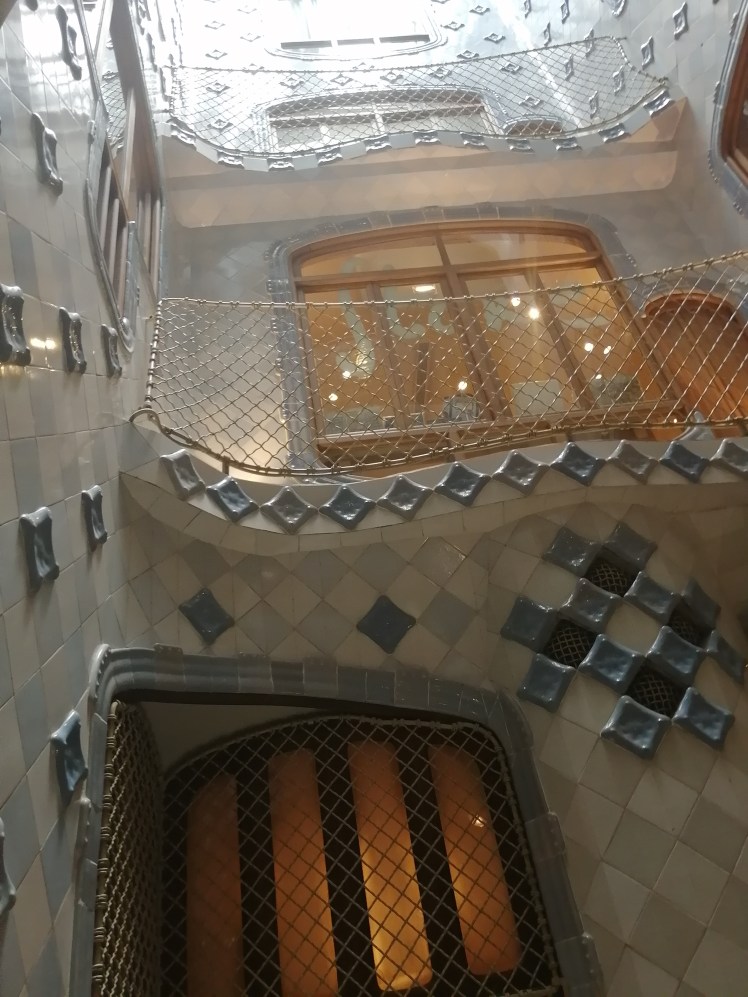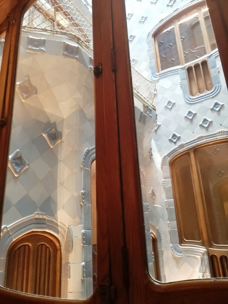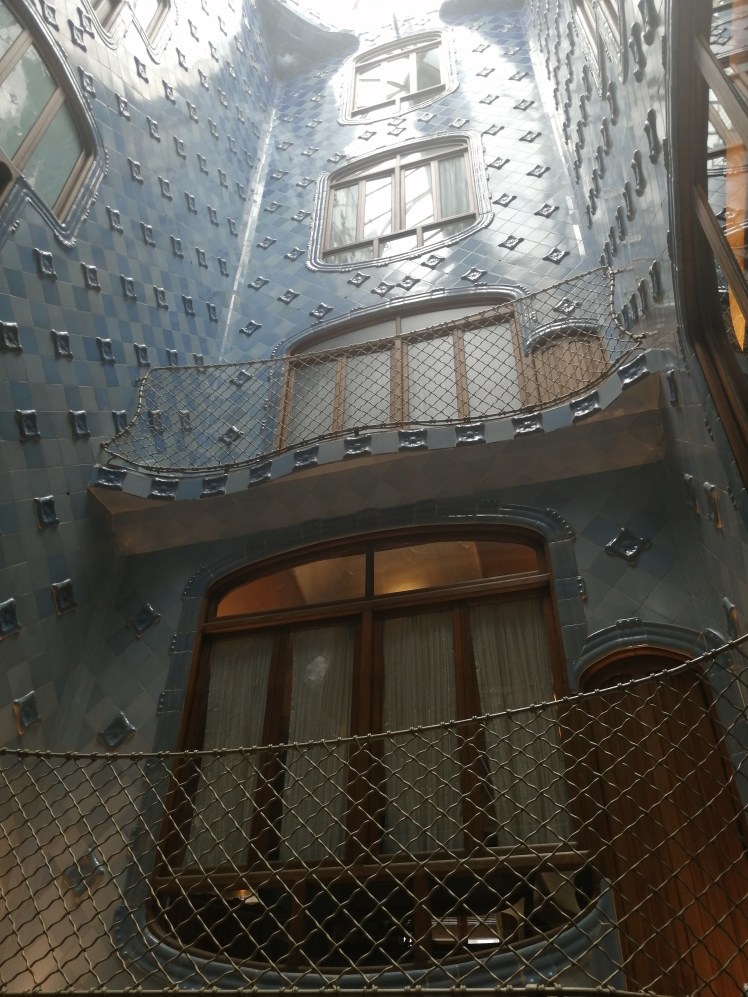 Ich schlendere die Stufen des Treppenhauses hinauf. Kleine Mosaikblättchen in allen erdenklichen Blautönen ziehen sich bis unter die Decke des Gaudihauses. Wie in einer Unterwasserhöhle komme ich mir vor. So maritim und mystisch wirken die Wände. Oder ein bisschen wie im U-Boot von Kapitän Nemo. Die meeresblauen Kacheln werden zum Boden hin immer heller und die Fenster nach oben hin immer kleiner. Der Eindruck einer gleichmäßigen Lichtverteilung entsteht. In der Belletage lebte die Familie Battlo. Die Mosaike der Dachfenster erinnern an Schildkrötenpanzer und verstärken die Unterwasser-Atmosphäre. Die romanischen, zarten Meeresfarben der Fenster legen den ‚Passeig de Gràcia‘ unter mir in unwirkliches, pastellfarbenes Licht. Weit weg fühlt sich der Trubel der belebten Straße an. Als würde ich durch ein Bullauge eine unbekannte Welt betrachten. Die Decke über mir spiegelt einen wellenförmigen, in sich laufenden Wasserstrudel wider. Die Kraft unter der See ist überall spürbar.