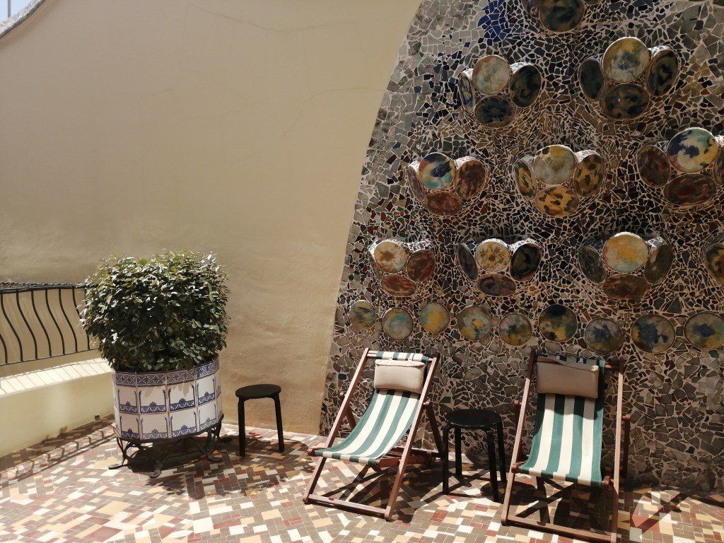 Wie es für Gaudi typisch ist, hat dieser sich bei der Renovierung des Hauses an Naturelementen orientiert. Senor Battlo zog mit seiner Familie in die ersten beiden Etagen. Ganz oben wohnten Dienstboten oder Mieter. Keine einzige gerade Linie konnte ich bisher im Inneren oder am Äußeren des Gebäudes entdecken. Dass alles hier handgefertigt ist, beeindruckt mich. Die Griffe an Türen und Fenstern sind sogar extra der Handführung der Bewohnern angepasst. Angeblich wurden selbst die Stühle nach Maß und Körperform angefertigt. Ganz oben betrete ich die frische, angenehme Luft der Dachterrasse. Die Aussicht über Barcelona ist grandios. Auch in diesem Bereich setzen sich Gaudis Muster und Mosaike fort. Selbst die Schornsteine mit ihren kleinen Hütchen zum Regenschutz sehen wahnsinnig toll aus.