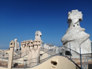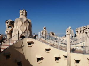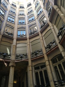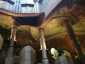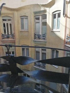 Langsam schlendere ich auf die Kassenschlange zu, die sich vor dem massigen, großen Gebäude die Füße platt tritt. Hauptsächlich besteht diese aus Kalk-Sandstein. Die Front des Hauses wirkt wie ein massiver Felsen. Wenn überhaupt, wird dieser nur durch die steinernen Wellenlinien und aus Eisen geschlagenen Ornamenten aufgelockert. Die wenig gleichmäßige Fassade mit den vielen ungeschliffenen Vorsprüngen fällt schon von weitem ins Auge. Die gusseisernen Balkongeländer sind in Handarbeit gefertigt worden und jeweils Einzelstücke. Das Gebäude wurde 1984 zusammen mit dem Park Güell und dem Palau Güell von der UNESCO als erstes Gebäude des 20. Jahrhunderts zum Weltkulturerbe erklärt. Einige der Büros im Innere werden sogar heute noch von alteingesessenen, katalanischen Familien genutzt. Ich trete nach endlosem Warten durch die Eingangstür des Hauses. Im Inneren des Gebäudes finden sich ebenfalls nur natürliche Formen. Einen rechten Winkel nehme ich nicht wahr.