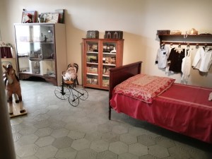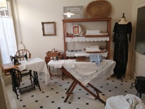 Mir scheint, dass auch der Bügelraum soeben erst verlassen wurde. Das Bügeleisen steht nach oben gekippt auf dem Bügelbrett, auf dem die feine Tischdecke liegt. Die nächste Pforte führt mich in die Küche. Grobschlächtigen, große Gusseisentöpfe stehen auf dem Herd. In einer Obstschale auf dem Küchentisch liegen Plastikäpfel. Daneben befindet sich das einfache Zimmer der Magd. Über der Kommode neben dem schmalen Bett hängt ein Bild der Dame des Hauses. Sie steht hinter dem Sessel ihres Mannes. Lose liegt ihre Hand auf seiner Schulter. Vielleicht ist sie es auch nicht. Gestellt wirkt alles, aber auch irgendwie wahr. Auf das elegante zierliche Sofa im Flur mit dem weißen Stoffbezug darf man sich leider nicht setzen. Ein Absperrband zieht sich über die Textilie. Die Fliesen des gewienerten Bodens glitzern unter meinen Schuhsohlen, als ich meinen Rundgang fortsetze. Genauso blinkt das Bad mit der ausladenden Badewanne. Hier ist sogar ein Bidet vorhanden. Auch im Treppenhaus gibt es keine geraden Formen. Wellenförmig teilt sich der Anstrich der Wand in Braun und Grün.