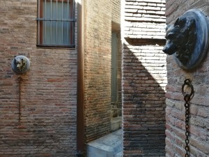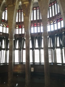 Er baute das Stadtpalais zwischen 1886 und 1890. Seit 1984 gehört der Guell Palast zum UNESCO Weltkulturerbe. Der Auftraggeber bewunderte Gaudi und erlaubte seinem künstlerischen Talent völlig freie Hand. Bald war Eusebi nicht nur Gönner, sondern unterhielt zu Gaudi auch freundschaftliche Beziehungen. Ich betrete den Eingang des von Außen eher unscheinbaren Palastes. Der Keller des Hauses wurde früher als Pferdestall genutzt. Hier beginnt mein Rundgang über die sanfte Rampe, die zum Anheben und Absenken der Pferde benutzt wurde. In die Wände sind Embleme mit metallenen Wölfen eingelassen. Ich fahre mit der rechten Hand über die eisernen Schlingen darunter, an denen die Pferde festgebunden werden konnten. Die nicht verputzten Backsteine fühlen sich rau unter den Fingern an. Der Kutscher wohnte hier unten schmucklos. In der Eingangshalle des Untergeschosses erwarten mich schmiedeeiserne Türen. Die Treppe ist mit buntem Teppich mit festlicher Dekoration ausgeschlagen. Ich betrete den rot-, orange- und goldverwebten Stoff und fühle mich sofort ziemlich wichtig. Früher saß hier auch der Portier, um Besucher zu empfangen. Der Holzboden dämpfte die Schritte der Pferde.