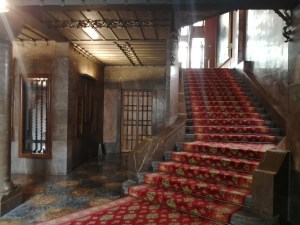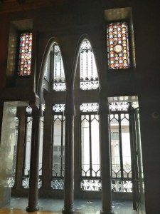 Ich schiebe den Kopf zwischen den Säulen am Aufgang hindurch. Und richtig! Mein Blick fällt auf 4 kleine Stufen an der Treppenaußenseite, die zu einer Plattform führen. Ganz bequem konnten Gäste hier vom Pferd herab oder aufsteigen. Ich stapfe die steinernen Stufen hinauf über den dicken Fußläufer, der jeden Laut im Keim erstickt. Im Obergeschoss befanden sich die private Bibliothek und die Arbeitsräume, in denen Eusebi Guell seine Geschäfte verwaltete. Über die Eingangshalle führt eine weitere prunkvolle Treppe in die Belle Etage. Ein Treppengeländer gibt es nicht, um die Harmonie des Raumes nicht zu gefährden. Rote Tropenholzwandvertäfelung mit schmiedeeisernen Ornamenten begleitet meinen Spaziergang. Ab dem ersten Stock kann man deutlich den außergewöhnlichen und liebevoll gesetzen Schmuck des Palastes erkennen. Der Flur, in dem ich jetzt stehe, wurde zu privaten Zwecken genutzt. Die Ornamente und der Dekorschmuck erinnern stark an orientalische Eindrücke und Tiere. Ein Beweis dafür, wie sehr Gaudi die spanisch-muslimische Architektur bewunderte.
