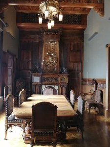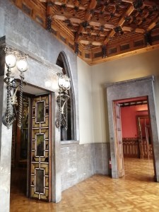 Ein Klavier steht einsam im Aufenthaltsraum. Tochter der Familie Isabell Lopez-Guell studierte nicht nur Klavier und Orgel. Sie komponierte auch. Alle Kinder genossen eine ausgezeichnete Ausbildung. Die besten Lehrer unterrichteten sie und halfen ihnen ihre literarischen und musikalischen Talente zu entwickeln. In dem Salon, in dem ich gerade stehe, gaben die Mädchen Klavierkonzerte. Die engsten Freunde trafen sich hier. Raucher zogen an ihren Zigaretten und Pfeifen im Rauchersaal. Auf den Ebenholzsitzbänken liegen seidene Kissen. Dunkles Holz spiegelt auch das Interieur der Tischgruppe des Esszimmers. Ich glaube, es ist stabiles Walnussholz oder Eiche. In den Wandschränken wurden die Liköre aufbewahrt. Eine unscheinbare Tür führt in Speisezimmer, wo die Gerichte auf Tellern angeordnet wurden. Der Speiseaufzug verband diesen Raum direkt mit der Küche. Ein verglaster Korridor verbindet den Palau Guell mit einem Haus an der Ramblas. Dort wohnte früher der Vater von Eusebi. Im Grunde ist das Stadtpalais eigentlich eine Erweiterung dessen Hauses. Die Kinder der Familie stellten in diesem Gang selbstgemachte Kunstwerke aus. Oder auch gesammelte Antiquitäten und Souvenirs.