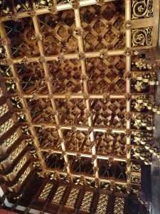 Ich spähe vorsichtig durch die Pforte zur Terrasse. Über den unteren Fenstern fasst sich eine goldene, wellenförmige Silhouette aus Wasserspeiern. Ein zierlicher Balkon mit einem schützenden Sonnendach aus Holz und Eisenstäben schützt die Hausbewohner vor der sengenden, spanischen Hitze. Um die Ecke liegt der Billardsaal mit altertümlichem Snookertisch. Die Guelltöchter malten hier oder übten sich im Bildhauen. Der Reichtum, die gesellschaftliche Stellung und der Wohlstand dieser Familie sind überall im Gebäude spürbar. Schlitzohr Gaudi setzte verschieden hohe Säulen, die in dreier Gruppen auf einem gemeinsamen Sockel stehen, ein, um den engen Raum größer erscheinen zu lassen. Dahinter liegt der Besucherraum. Atemberaubend schön, aber auch irgendwie überladen empfinde ich die Blattgoldverzierung der Eichenholzdecke. Besucher konnten hier mittels einer Jalousie unterhalb der Vertäfelung vom darüber gelegenen Stockwerk ohne deren Kenntnis beobachtet werden. Dafür scheute man keine Kosten und beunruhigte den verantwortlichen Buchhalter während der Bauarbeiten dadurch immens.
