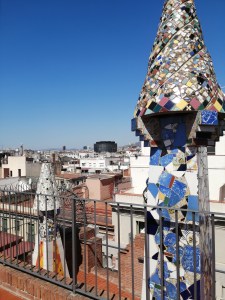 Gaudi verarbeitete auf äußerst einfallsreiche und erfinderische Weise Keramikbruchstücke. Mit einer wohltuenden Illusion bannen sich die Gedanken des Architekts in einer farbenfrohen Einbildung und Surrealität. Gut tun seine zauberhaften Werke in diesem Stadtluftschloss. Schon erwachen die Mosaikschornsteine zu markanten Wächtern des Daches aus Keramik oder Ziegelstein. Ungewöhnlichen Formen, die wohl nur Gaudí erschaffen konnte. Da bin ich mir ziemlich sicher. In der Mitte der Dachterrasse erstreckt sich die 15m lange Sandsteinnadel der Kuppel, die den zentralen Salon bedeckt und beleuchtet. Von hier aus genieße ich den herrlichen Blick auf die Stadt. Eine leichte Brise zaust an meinen zusammen gebundenen Haaren. In der Ferne erkenne ich den Hausberg Barcelonas, den Montjuïc. Ich stehe in Gaudis überschäumender, wunderbarer, wohltuender Fantasie der Farbenpracht und möchte an diesem Tag nirgendwo anders sein. Bis bald Barcelona. Das verspreche ich.