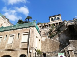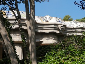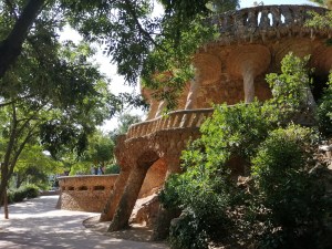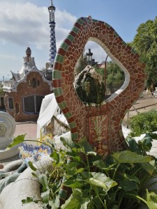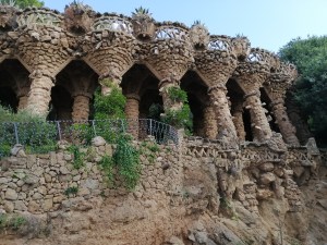 In diesem Säulensaal erwarten mich ebenfalls wunderbare Bildmosaike an der Decke. Eigentlich war dieser Raum einmal als Markthalle gedacht gewesen. Ich drehe mich um die eigene Achse in diesem Wald voller Säulen. Beim Bau dieses Gebildes ließ Gaudi sich von der altgriechischen Architektur des Tempels von Delphi inspirieren. Direkt dahinter erstrecken sich die grünen Triebe des Parks. Ein Gewirr aus Wegen, Laubengängen, Viadukten, Mauern und Brücken tut sich auf. Dem Architekten gelang es, sein Werk vollkommen dem Wesen der Natur anzupassen. Daraus geworden ist ein liebevoll bunter, magischer Märchengarten. Abseits vom Trubel der Großstadt Barcelona kann man hier in Ruhe und Stille spazieren. Die gesamte Anlage ist wunderschön gestaltet und überrascht mit vielen gefühlvollen, behutsamen Details. Ich genieße die tolle Aussicht auf die Stadt, bis hin zum Meer. Diese parkähnliche Gartenanlage sucht ihres Gleichen.
