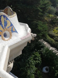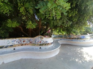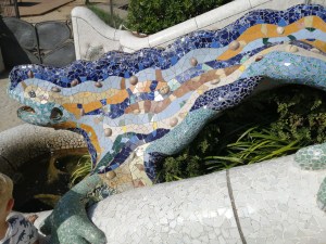 Ich stehe vor der großen Freitreppe direkt am Eingang des Parks. Die Dächer der Pförtnerhäuschen sehen aus, als hätten diese in Zuckerguss gebadet. Neugierig beäugt mich der bunte Salamander, der auf den Stufen der Zugangstreppe sitzt. Vielfältigen schillernde, farbenprächtige, zierlichen Keramikstückchen überziehen die Haut seines Rückens bis hin zu Gesicht und Beinen. Die Echse, die das Element Feuer symbolisieren soll, ist in so gut wie jedem Souvenirladen Barcelonas in klein oder größer zu finden. Zum Beispiel als Magnet für den Kühlschrank. Sie ist das berühmte Aushängeschild von Gaudis Park Güell. Im Original kann ich diese leider nicht mehr bestaunen. Dieses wurde leider vor ein paar Jahren durch Vandalismus zerstört. Die Sonne spiegelt sich auf dem aus vielen winzigen Teilchen bestehenden Mosaik. Blaue Lichtblitze winden sich von der haut des Ungetüms bis hin zu meinen Augen. Ich schlender die Stufen hinauf zum 3.000m2 großen Terrassenplatz, der überall und umfassend mit gelblich braunem Sand bedeckt ist.