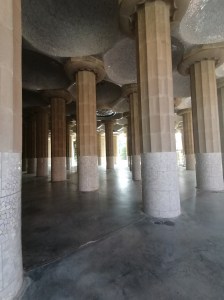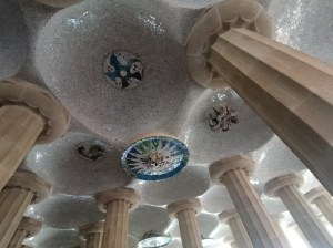 Kleinste Keramik- und Kristallteilchen glitzern wie der Kamm einer sprudelnden Welle in den gleißenden Sonnenstrahlen. Ich setze mich auf die weiße Bank, die sich wie ein Wellenkamm als Begrenzung der Sandterrasse dahinzieht und bewundere die Mosaikarbeiten. Meine Finger fahren über die vielen Bruchstücke der bunten Keramik. Eigentlich sollte hier ein Amphitheater für Veranstaltungen entstehen. Die Steinbank, auf der ich sitze, ist ergonomisch. Gaudi wollte diese dem menschlichen Körper anpassen. Um ihr die entsprechende Form zu geben, bat er einen seiner Arbeiter, sich zu setzen und als Modell zu dienen. 86 Säulen tragen das Plateau, dessen Mosaikrand sich in gekräuselte Wellen legt. Diese Säulen sind innen hohl und kanalisieren das Regenwasser, das sich auf dem Platz sammelt. Eine weitere geniale Machart Gaudis. Unter dem Platz formen sie eine offene Halle.