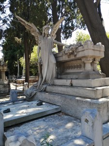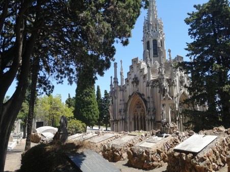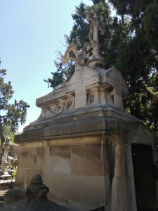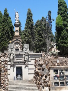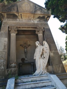 Die Hanglage des Friedhofs zwingt mich zu einem Gang mit andauerndem Auf und Ab. Die Besichtigung ist daher etwas mühsam. Es ist ganz still. Ein leichter Windhauch zerreißt die Tonlosigkeit. Erfrischend zaust die kühle Böe die Haare von meinem heißen Gesicht. Es scheint, Barcelona käme hier zur Ruhe. Ich auch. Das Areal ist reich an außergewöhnlichen Grabmälern und Gruften. Beim Bau der Grabstätten für die großbürgerlichen Familien Barcelonas haben einige der bekanntesten katalanischen Jugendstilarchitekten mitgewirkt. Stilistisch sind die Grabkapellen nicht einheitlich gestaltet, sondern recht gemischt. Jugendstil, Neoklassik und Neogotik überwiegen.