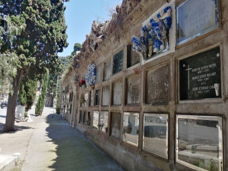 Der Zeigefinger des Katalanen zeigt ganz strikt geradeaus. ‚Immer da lang.‘ verstehe ich mit meinen schlechten Spanischkenntnissen. Dann führt er mit der geschlossenen Hand eine Welle nach Unten. Ich muss also irgendwo drunter durch Laufen. Ich bedanke mich zügig und laufe unentschlossen los. Der Friedhof Montjuic in Barcelona ist nicht an das U- oder S-Bahnnetz angeschlossen. Es fahren lediglich Busse, was die Sache für mich ungleich schwieriger macht. Ich hatte in der Innenstadt keine passende Buslinie oder Haltestelle gefunden und war einfach losgelaufen. Vermutlich hatte ich mich in der Einschätzung der Entfernung etwas verschätzt. Die Fußsohlen schmerzen bereits und vom Eingang zum Friedhof ist noch lange keine Spur. Letztlich dauert es auch noch eine ganze Weile und einen anstrengenden Fußmarsch, bis ich die zierlichen Grabsteine auf dem Friedhofshügel in der Ferne ausmache. Das Areal ist also überaus schwer zu finden.