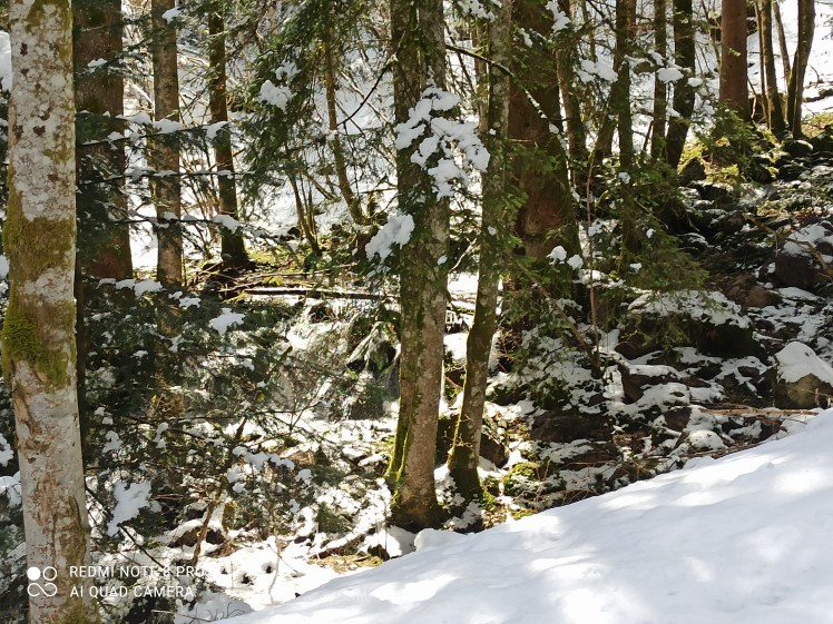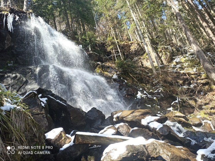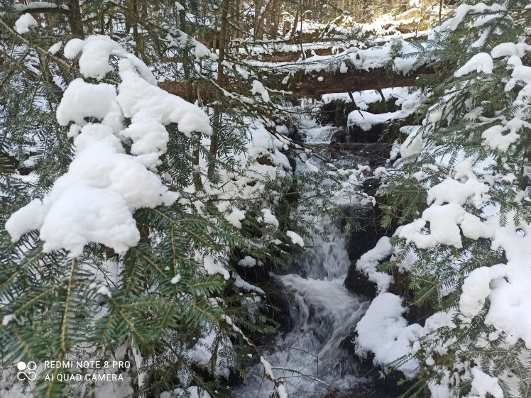 Dennoch sind die Wege matschig und nass. Blätter schwimmen in den Pfützen auf den sandigen Wegen. Zierliche Kiesel ragen spitz aus der Erde. Kleine Zweige sind über den schmalen Pfad verstreut. Ich schnaufe, der Weg ist beschwerlich. Dann rutschen meine Füße weg. Ich rudere mit den Armen. Unsanft lande ich im feuchten Schnee. Ich schüttle die Eiskristalle von meinem Ärmel. Jetzt sind die Socken endgültig durchnässt. In naher Ferne höre ich die Wasserfälle klangvoll die Felsen hinab rauschen und letztlich den Waldboden tränken. Ein Stück über mir donnert das Wasser eine steinerne Wand herunter. Doch zunächst gilt es noch ein Hindernis zu überbrücken. Mitten auf dem Waldweg türmt sich vor mir ein riesiger Felsbrocken. Ich versuche über diesen zu klettern, aber er ist ebenso breit wie groß. Schließlich zapple ich breitbeinig wie ein Käfer auf dem Gesteinsblock, ein Bein zu jeder Seite. Der eisige Schnee durchdringt rasch den Hosenboden meiner Jeans. Endlich kann ich mich hinüberschieben und einige meiner Zehen berühren den Boden. Sogleich senkt sich die Spitze meines Schuhs in die Pfütze, die sich unter dem Felsblock gebildet hat. Mit einem lauten Platsch berühren beide Füße wieder den Boden. ‚Schöner Mist‘, sage ich laut. Aber wenn ich jetzt schon mal da bin, schaue ich mir die Kaskaden natürlich an.