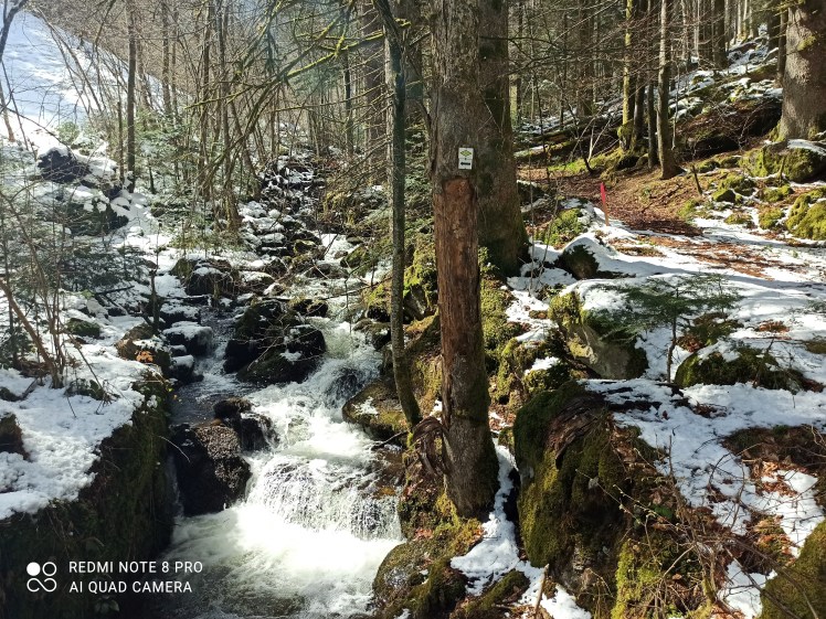 Nach einer kurzen Kletterpartie über schneebedeckte Gesteinsformationen erreiche ich den Zweribachfall. Immer ein Stückchen weiter rutsche ich über die Felsen heran zum Wasserfall. Eigentlich stehe ich Todesängste aus. Lange durchsichtige Eiszapfen hängen an der Gesteinswand, über die das Wasser herabrauscht. Hose nass, Socken nass, alles nass. Die Hände sind bedeckt von Moosresten und kleinen Kieseln vom Klettern über die Steine. Mit ein wenig Schnee reibe ich meine Finger sauber. Auf dem Rückweg zum Auto begegne ich einem Vater mit seinem Sohn. Durch Ihre Wanderstöcke haben diese einen viel sichern Halt, als mir meine einfachen Turnschuhe geben. ‚Soll ich ein Foto von Ihnen vor dem Wasserfall machen?‘ fragt der Wanderer freundlich. ‚Dankeschön‘ ich schüttle den Kopf. ‚Mir reicht das wirklich so.‘ Er lacht und nickt mir freundlich zu. ‚Man ist ja sonst nie selbst drauf, daher frage ich.‘ Mir reicht es wirklich. Um keinen Preis würde ich wieder umdrehen. Die vielen Gesteinsbrocken, der Schnee, das Eis, die zierlichen Zweige und das feuchte Moos. Ich werde sicher nicht noch einmal die Kletterpartie über die schneebedeckte Winterwelt wagen. Durch Matsch, Pampe und geschmolzenen Schnee laufe ich zurück. Aber ich wollte es ja mal wieder wissen.