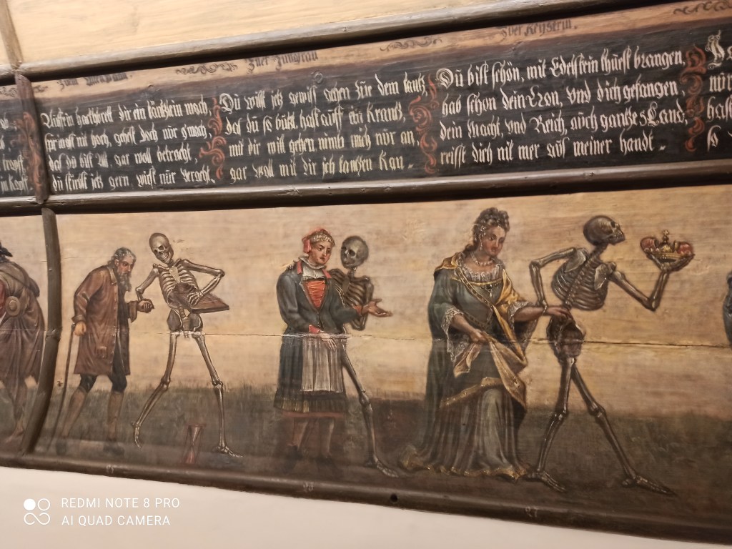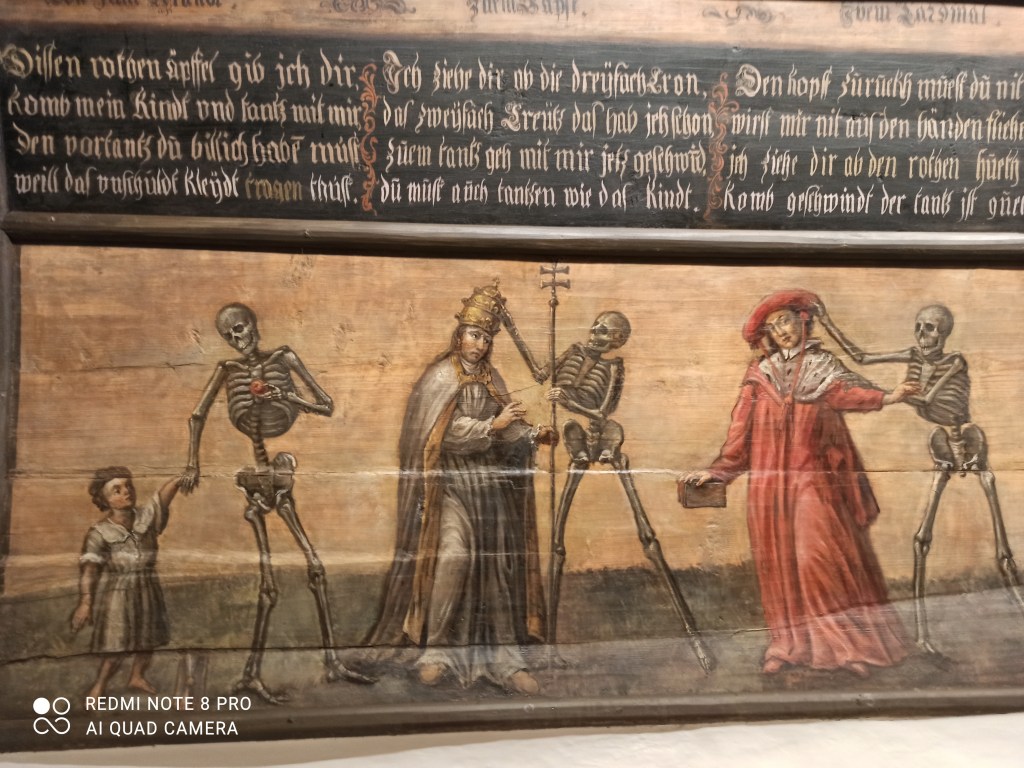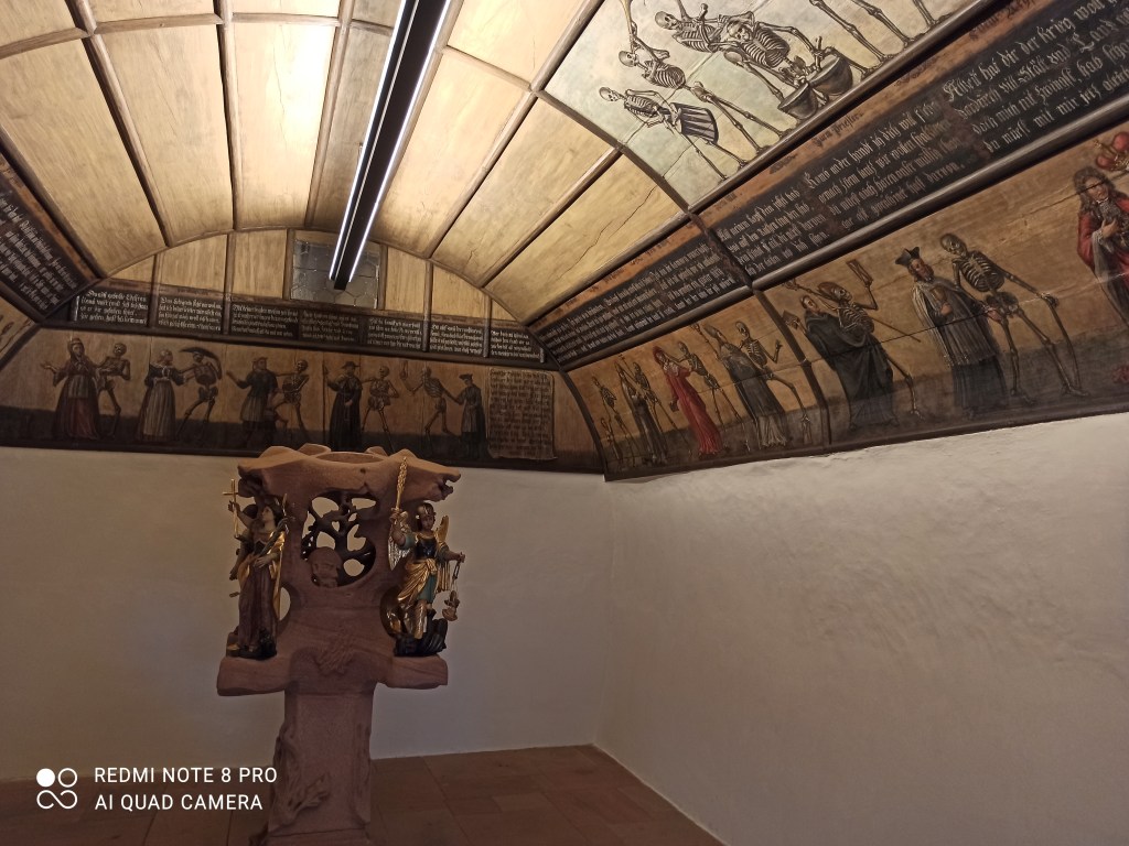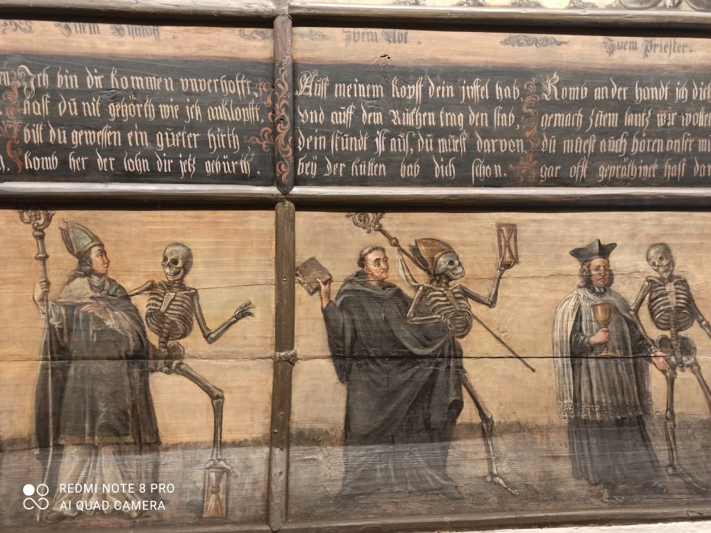 Schwermütig fällt die Glastür ins Schloss. Ein zarter Lufthauch quetscht sich durch den schmalen Spalt und streicht als sanfter Hauch über das alte Gemäuer. Ich blicke zur Decke der kleinen Kapelle in Gutach-Bleibach im Schwarzwald. Direkt über mir, die fleischlosen Kiefer leicht zum lautlosen, hämischen Grinsen geöffnet, tanzen Skelette mit Menschen aus den verschiedensten Berufen und Gesellschaftsschichten. Die Botschaft ist klar: Der Tod holt eines Tages jeden ab, egal ob reich oder bettelarm, klug oder strohdumm, schön oder furchtbar hässlich. Schon greift ein Knochenmann aus dem Totenspuk nach einer goldenen Krone. Der König muss wie jeder andere natürlich auch irgendwann sterben. Am Lebensende trifft es alle gleich. Auch den Geistlichen, der neben dem Adligen steht, hat der Gevatter bereits am Schlafittchen. Eindringlich fast der Sensenmann dem Bischof an den prächtigen Mantel. Ein Tanz auf Gedeih und Verderben, der nur tödlich enden kann. ‚Ich will Dich jetzt mitnehmen!‘ so steht es dem lächelnden, hautlosen Schädel ins Gesicht geschrieben. Ein Abt sieht beschämt weg. Schon erfassen diesen die leeren, schwarzen Augenhöhlen des Gerippes. Weltlich oder religiöse Mächte haben hier keinen Belang. Angst steht in den Augen des Kaisers als sich eines der Todesengel ihm zuwendet. Kriege hat er erfolgreich geführt, aber gegen den Gang in die Ewigkeit kann er nicht revoltieren. Auch ein kleiner Junge tritt leider seinen letzten Gang an, mit einem knallroten Apfel in der knöchernen Hand lockt der hagere Begleiter. ‚Komm mein Kind und tanz mit mir.‘