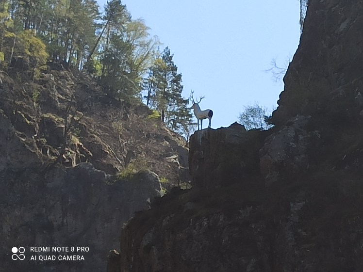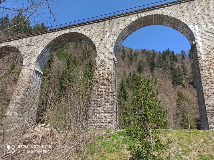 Entsetzt springt der Motorradfahrer zur Seite. Schützend hält er den Ärmel seiner Lederjacke vor seine Mitreisenden, um diese abzuschirmen. Mein kleiner Wagen war viel zu rasant auf den zierlichen Parkplatz unterhalb des Hirschsprungs bei Breitnau gefahren. Die bronzene Tierskulptur leuchtet beim Hinaufsehen in glänzendem Weiß. Einer Sage zufolge soll hier ein Ritter der Burg Falkenstein auf der Jagd gewesen sein. Er sichtete im Gebiet des Höllentals einen wunderschönen Hirsch, den er zielgerichtet verfolgte. Von Todesangst getrieben, sprang der Geweihträger über den weit klaffenden Abhang und landete durch den gewaltigen Satz auf der gegenüberliegenden Schluchtseite. Laut der Legende entkam er so seinem Verfolger. Unschlüssig sehe ich mich um. Einen Weg hinauf zur Statue kann ich unglücklicherweise nicht finden. Also knipse ich vom Parkplatz aus nur ein paar Fotos, dann steige ich wieder in meinen Wagen. Ich will zum Wandern in die Ravennaschlucht, denn gänzlich ohne Spaziergang fahre ich nicht wieder heim. Direkt am Hofgut Sternen befindet sich ein großer Parkplatz. Wenige Besucher und Naturliebhaber sind unterwegs, hauptsächlich Familien. Ich lade mir meinen Rucksack mit Proviant auf den Rücken und marschiere los. Am Eingang zur Klamm empfängt mich die Ravennabrücke, ein imposantes Aquädukt und heute Bahnstrecke. Die Ravennabrücke ist 224 Meter lang und 36 hoch. Gerade fährt die Schwarzwaldbahn darüber. Die knallgelben Wagen glänzen in der hell gleißenden Sonne.
