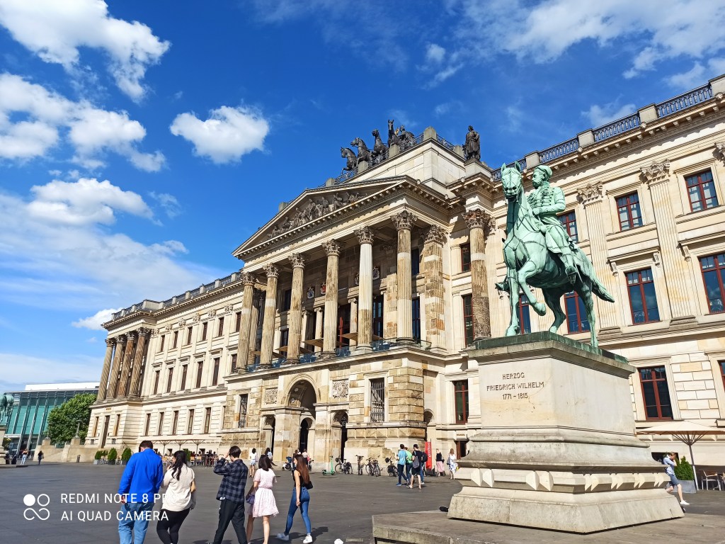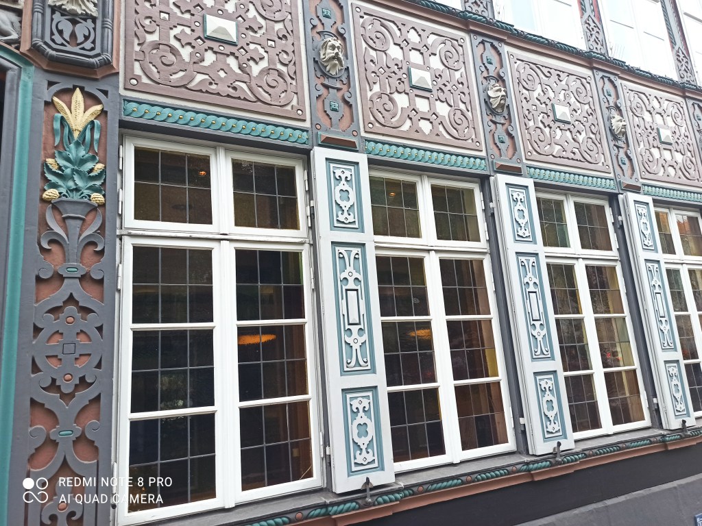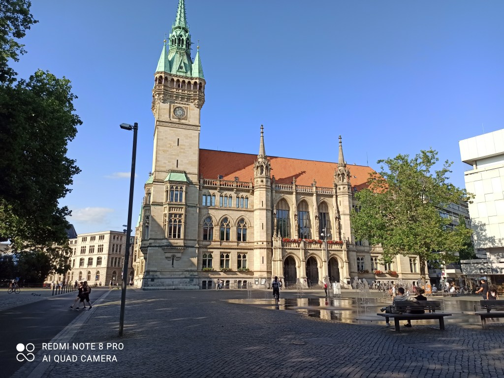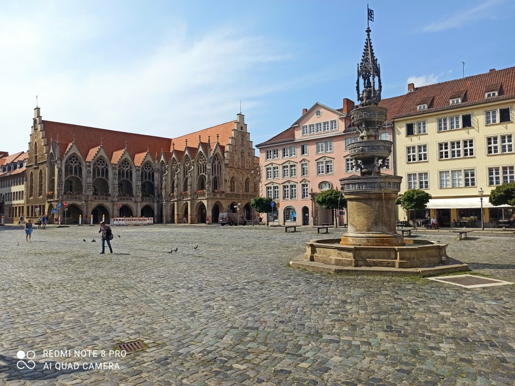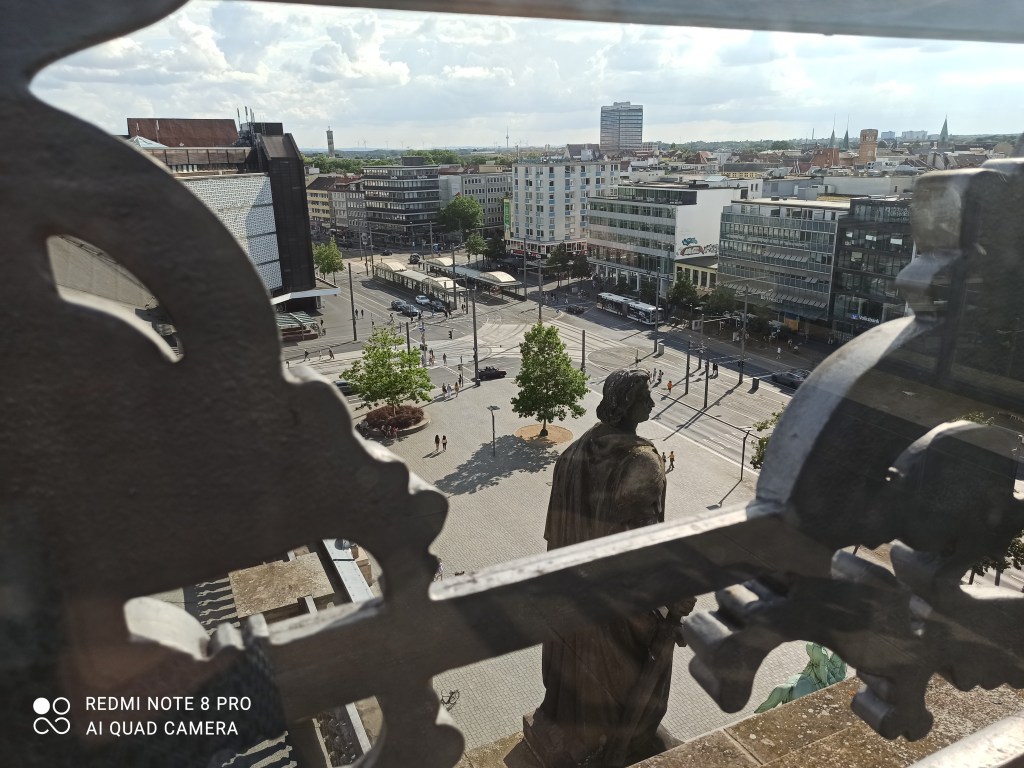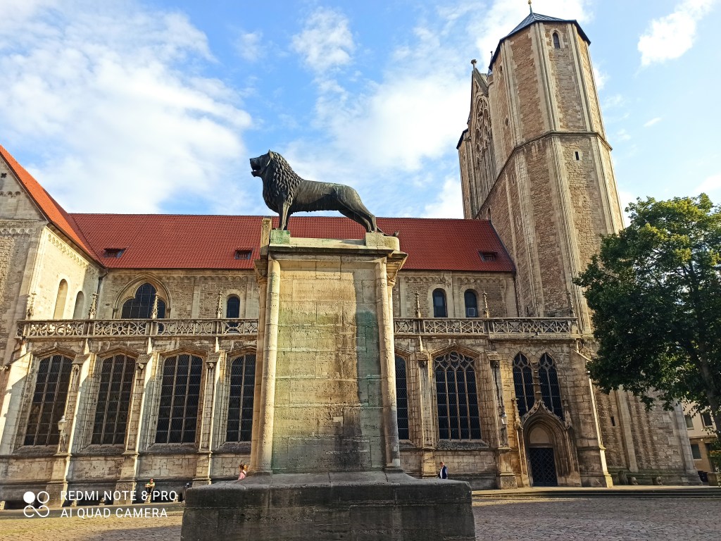 „1975 wurde die Figurengruppe eingeweiht und hier am Sack aufgestellt.“, führt die Gästeführerin weiter aus. „Zur feierlichen Enthüllung kamen damals viele Kunstkritiker. Als das Tuch fiel, sahen diese auf den ersten Blick zwei züchtig bekleidete Ringer. Der Halbgott trug einen Ringeranzug, der Riese eine knappe Hose. Erst auf den zweiten Blick waren auf dem in der Luft hängenden Hinterteil von Antäus die Besonderheiten zu erkennen: Auf den Beinen des Riesen standen gut leserlich die Worte „Kunst“ und „Kritiker“. Direkt auf dem Po waren auf alle Zeiten die Namen der lautesten Kritiker des Nackt-Entwurfs eingraviert. Herkules trägt dabei wie sein Erbauer Weber die Initialen „J.W.“. Der Gegner symbolisiert die Kritik, der durch den Bildhauer der Boden weggezogen wird.“ Sie geht etwas weiter um den Brunnen herum. Ich folge ihr und wir versammeln uns alle zu Füßen von Zeus Sohn. „Schauen Sie!“ Ich folge dem Blick der Dame zum Boden. „Jürgen Weber alias Herkules steht auf einer unebenen Scheibe, die einen Löwenkopf darstellt. Braunschweig wird ja, da Heinrich der Löwe 1158 die Stadt gegründet hat, auch Löwenstadt genannt. Die Füße hat er ein wenig angehoben, der Künstler tritt sich auf dem Kopf des Raubtieres die Zehen ab und scheint zu meinen: Danke, Löwenstadt, für die Kritik!“ Ich lächle erneut. Diese lustige Art sich zu wehren macht zumindest die Stadtführung interessant. Und durch die Führung von Touristen hat Braunschweig auch heute noch etwas davon.