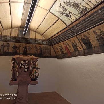 Schwermütig fällt die Glastür ins Schloss. Ein zarter Lufthauch quetscht sich durch den schmalen Spalt und streicht als sanfter Hauch über das alte Gemäuer. Ich blicke zur Decke der kleinen Kapelle in Gutach-Bleibach im Schwarzwald. Direkt über mir, die fleischlosen Kiefer leicht zum lautlosen, hämischen Grinsen geöffnet, tanzen Skelette mit Menschen aus den verschiedensten Berufen … Mehr Tanz der Skelette